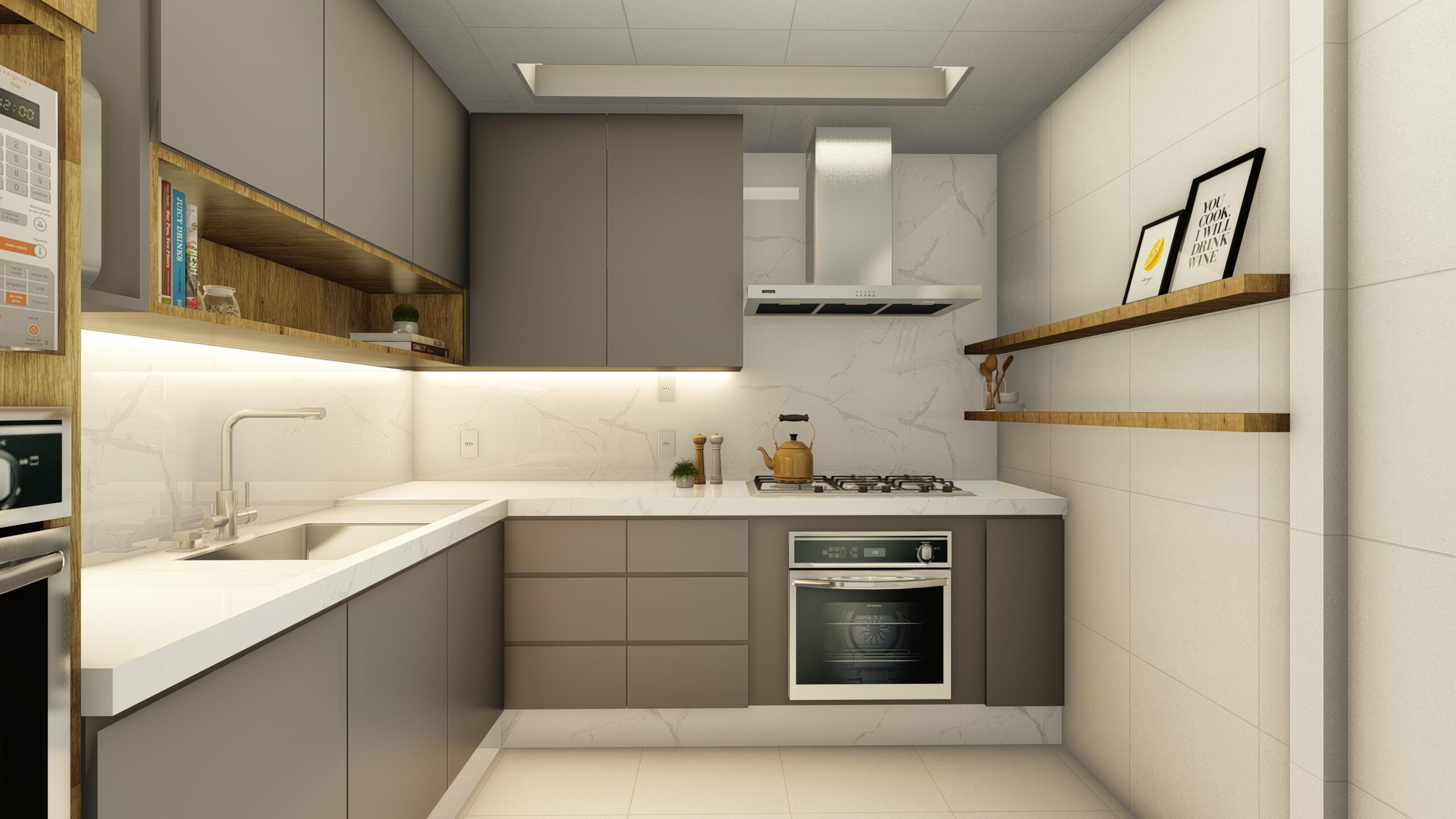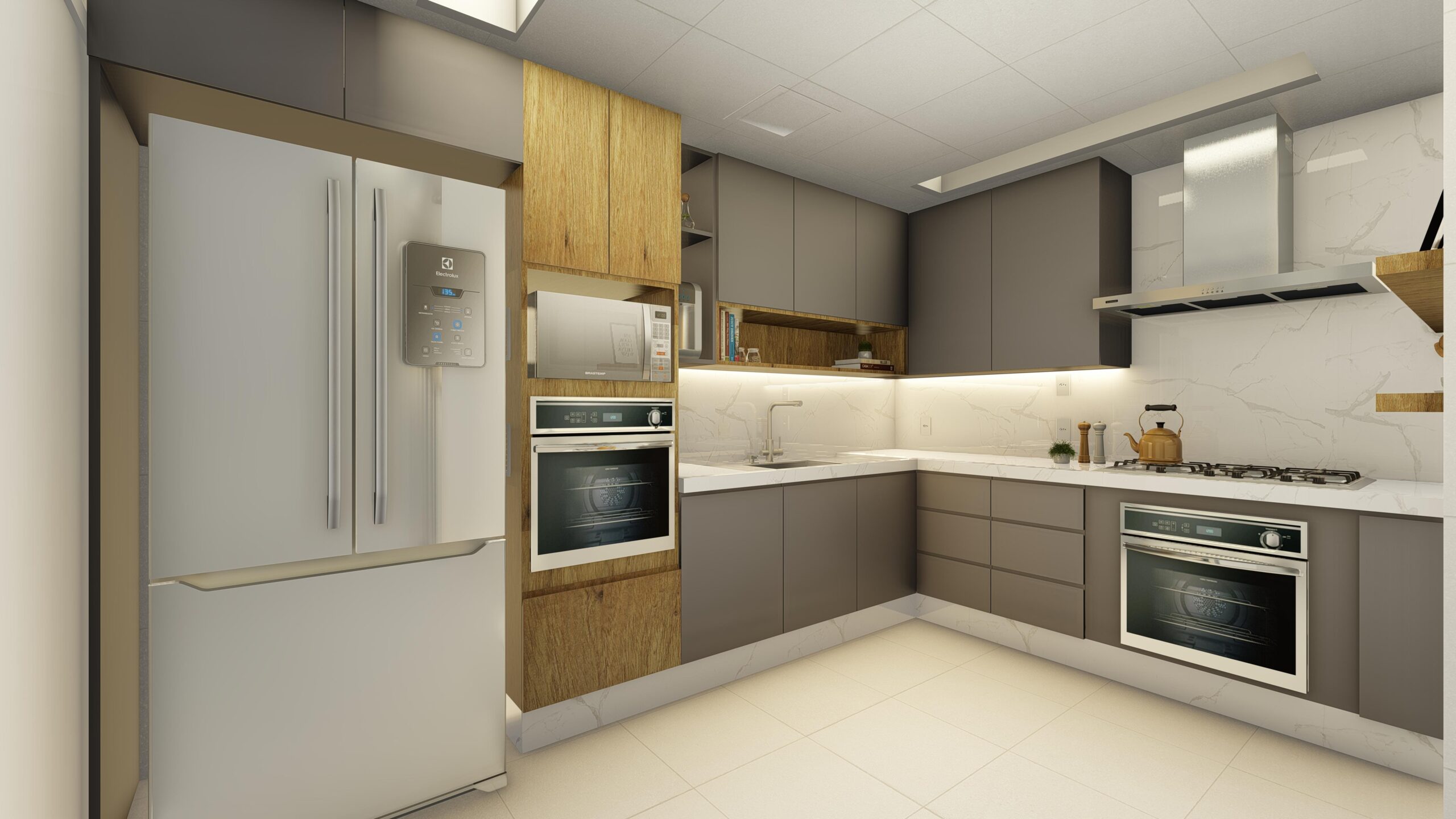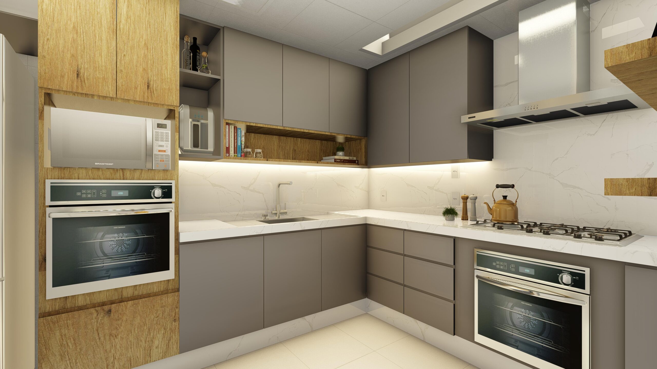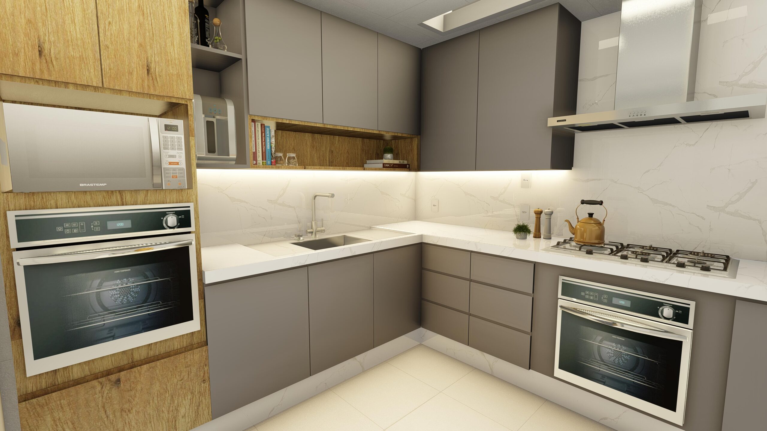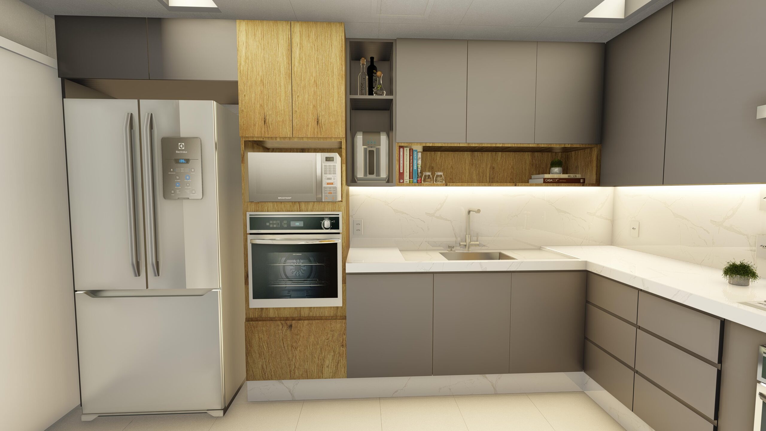 Estética Elegante: O projeto da cozinha cinza minimalista destaca-se pela sua estética elegante, com uma paleta de cores predominantemente cinza que cria uma sensação de serenidade e sofisticação.