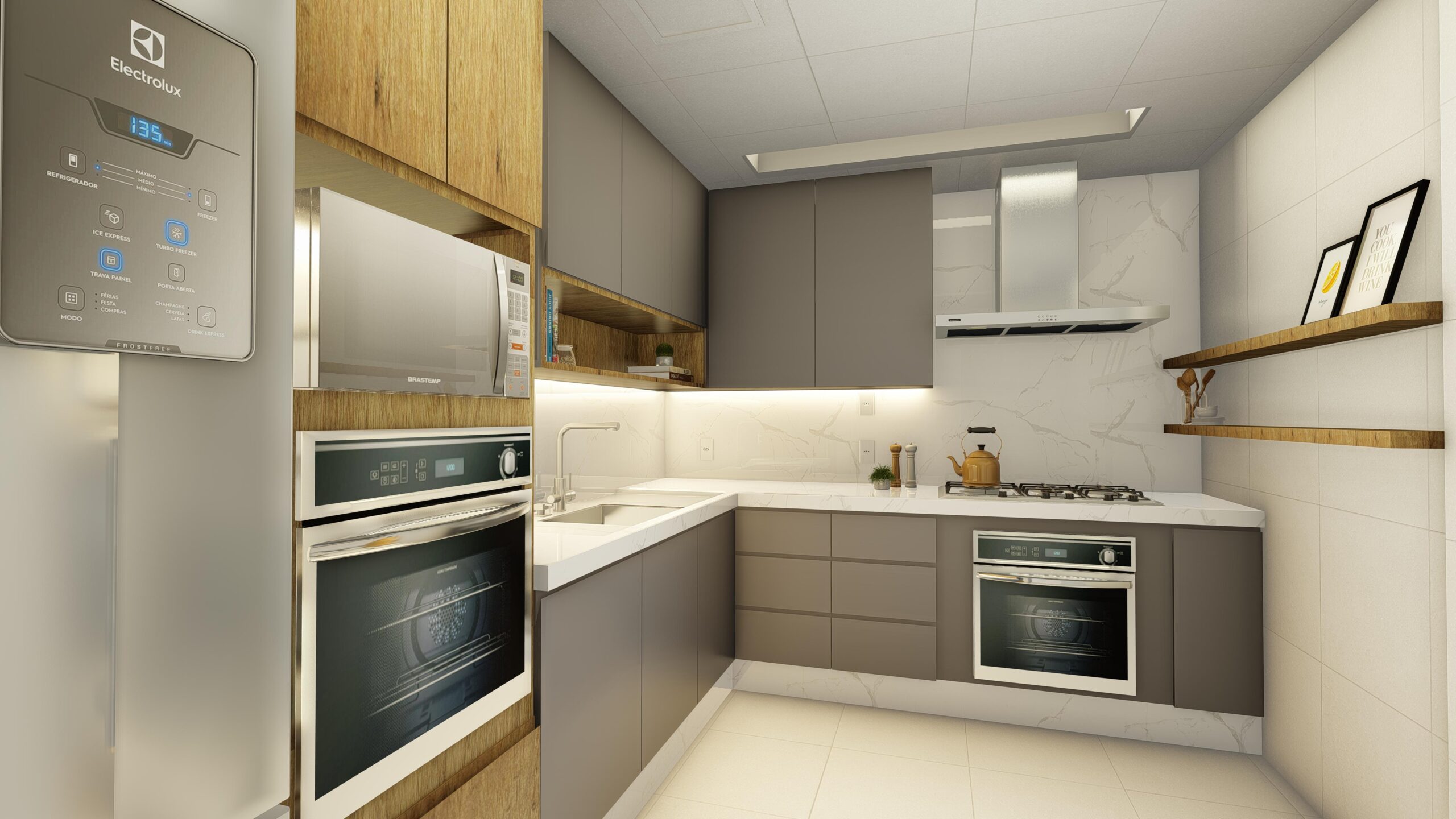 Clientes: Este projeto personifica o minimalismo em sua essência, como pedido pelos clientes, equilibrando a estética elegante com funcionalidade prática para um ambiente de cozinha verdadeiramente